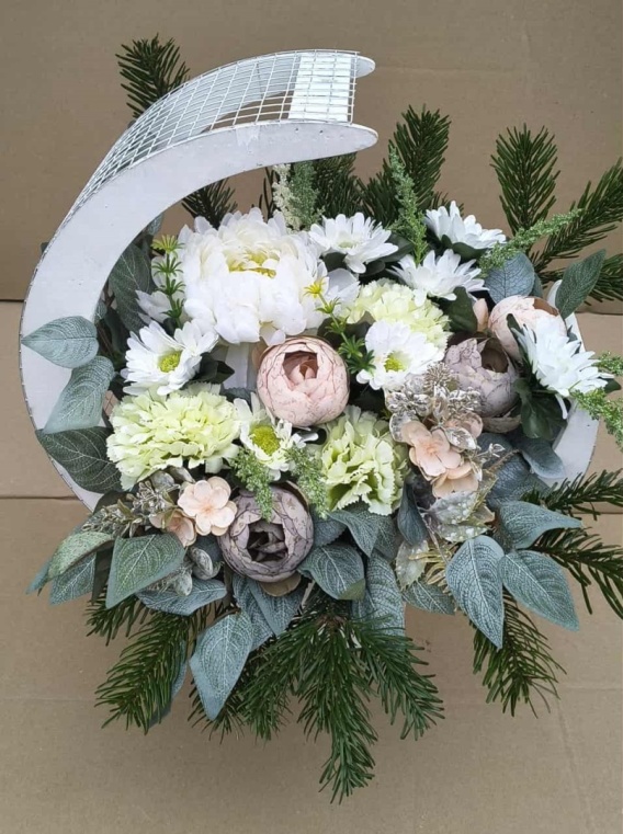 Stroik ze sztucznych kwiatów w koszu w kształcie księżyca, z żywą jodłą.