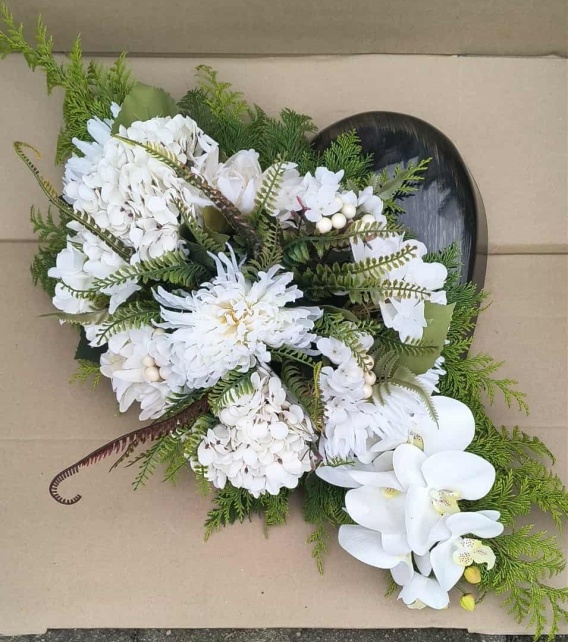 Stroik ze sztucznych kwiatów i żywej tui na podstawie serce.
