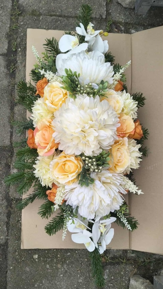 Stroik ze sztucznych kwiatów i żywej jodły.