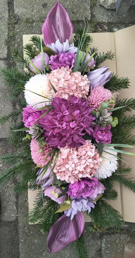 Stroik ze sztucznych kwiatów i żywej jodły.