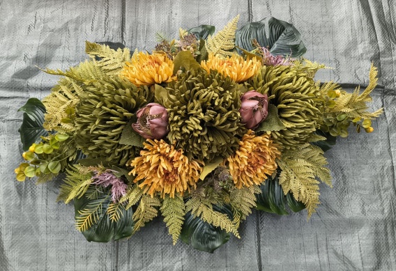 Stroik z musztardowych i zielonych chryzantem z dodatkiem karczocha w różowym odcieniu.