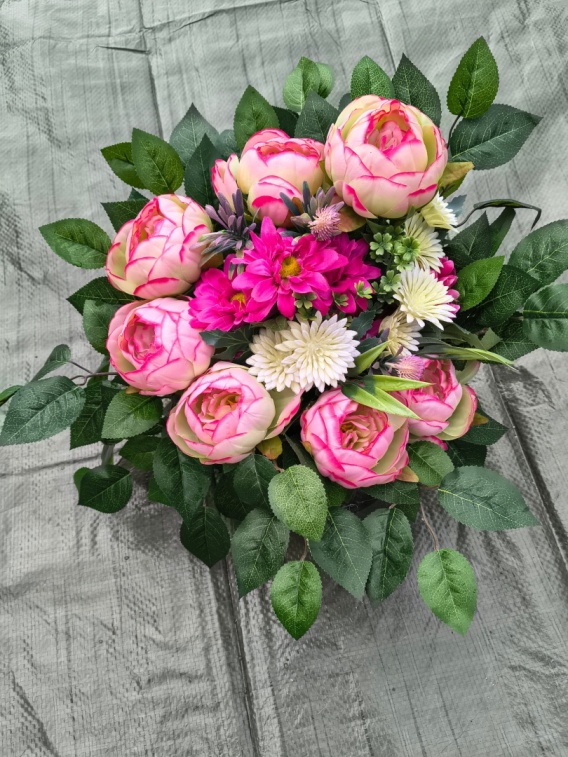 Stroik na podstawie w kształcie "ikebana" z różowymi margaretkami i biało-różowymi kamelkami.