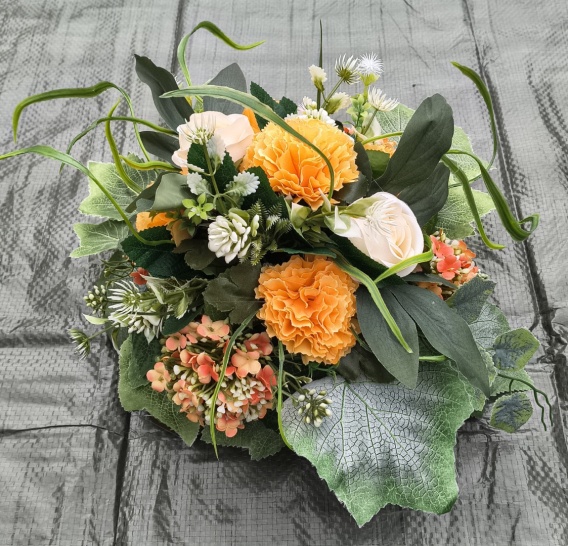 Stroik z pomarańczowych goździków z jasnymi dodatkami.