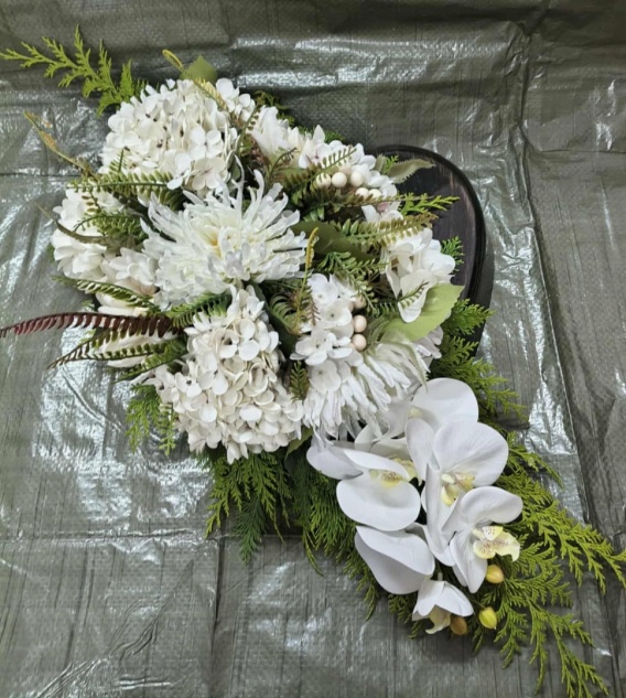 Stroik na podstawie w kształcie serca z wykorzystaniem żywej tui z białym storczykiem, białymi hortensjami i chryzantemami.