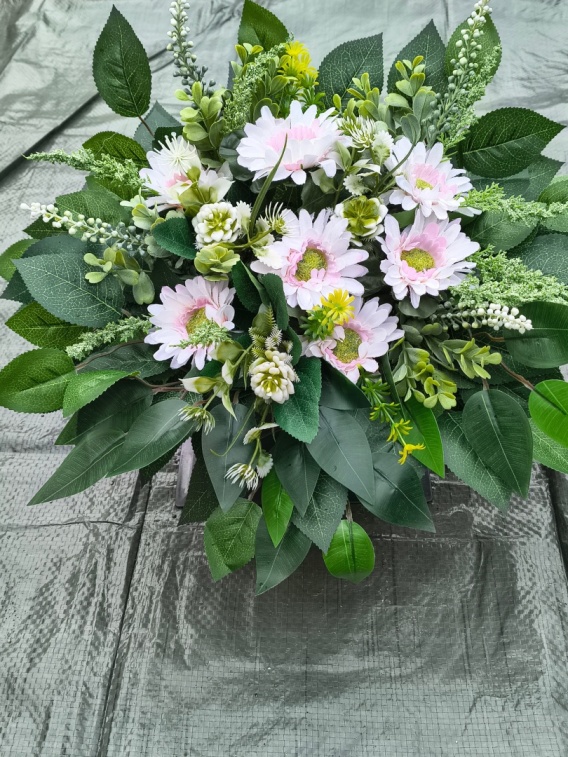 Stroik na podstawie w kształcie serca z biało-różowymi margaretkami.