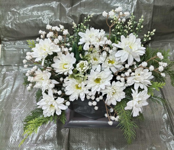 Dekoracja florystyczna z białych margaretek ułożona na podkładzie ze świeżej tui i osadzona na podstawie w kształcie serca. Utrzymana w klasycznym stylu. To uniwersalna ozdoba, która pasuje do różnych typów nagrobków.