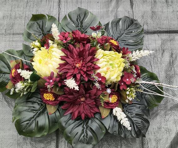 Stroik z bordowych gerber i pistacjowych chryzantem.