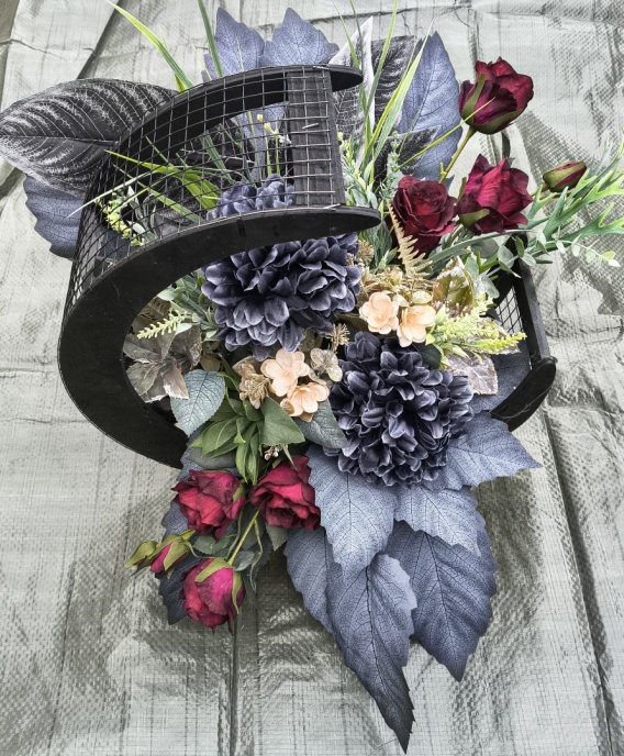 Stroik w koszu w kształcie księżyca z grafitowymi chryzantemami i bordowymi różami.