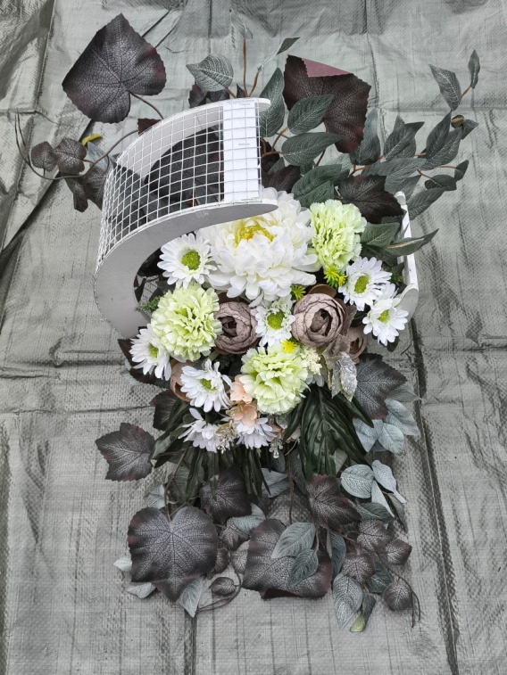 Stroik w koszu w kształcie księżyca z pistacjowymi goździkami wzbogacony kwiatami w jasnych odcieniach na tle ciemnych liści, zachwyca swoją estetyką i jakością wykonania. Doskonały do dekoracji grobu przez cały rok.